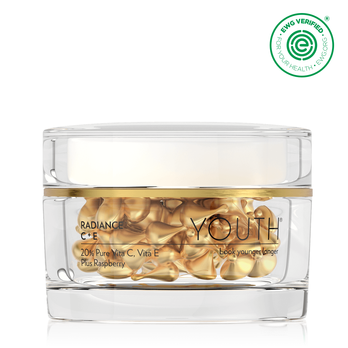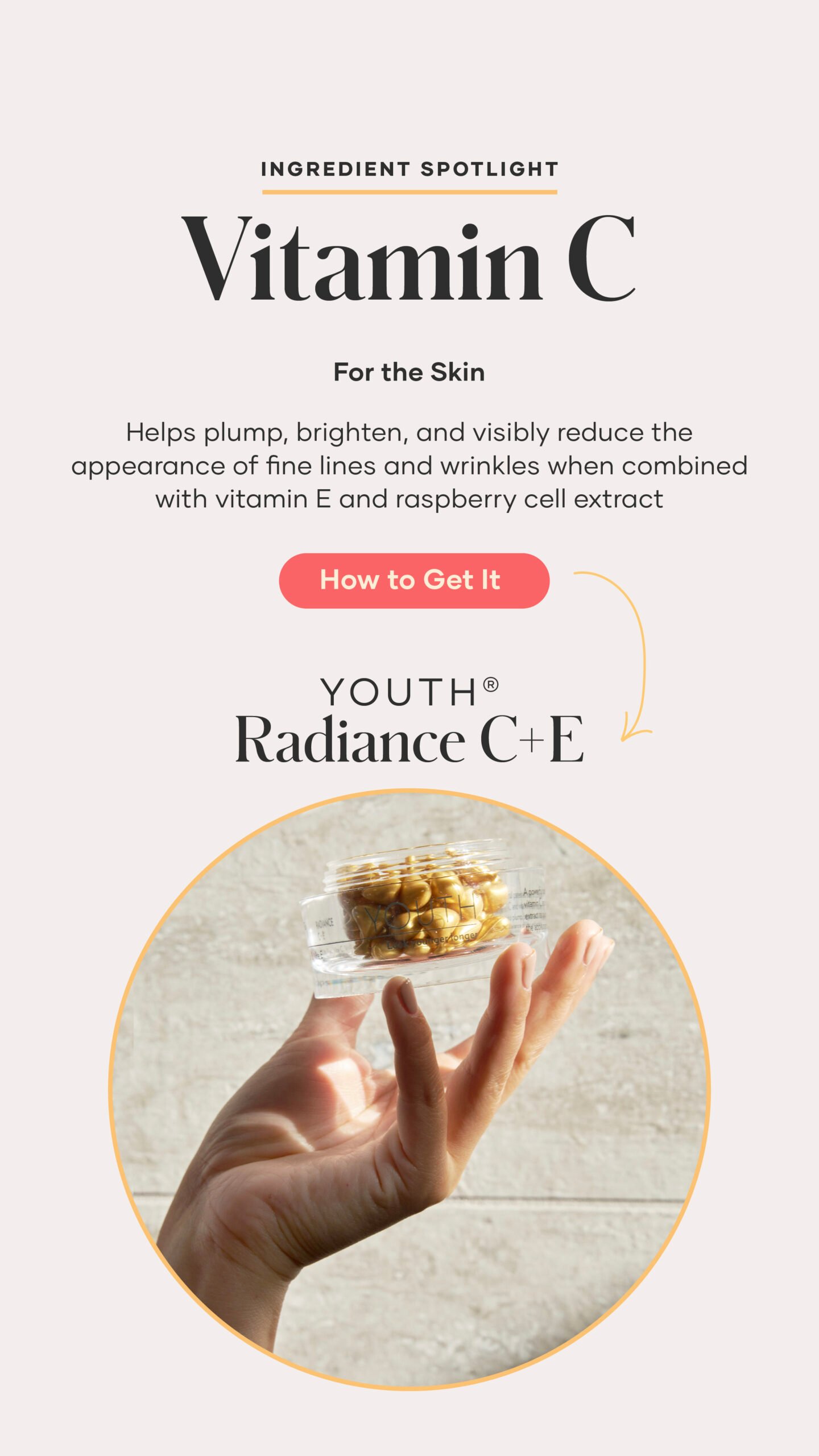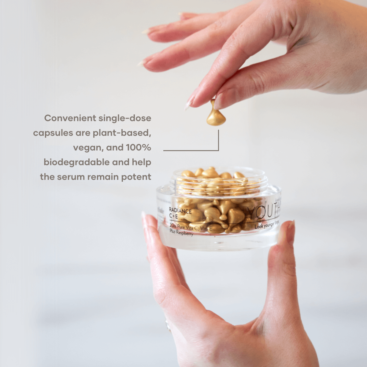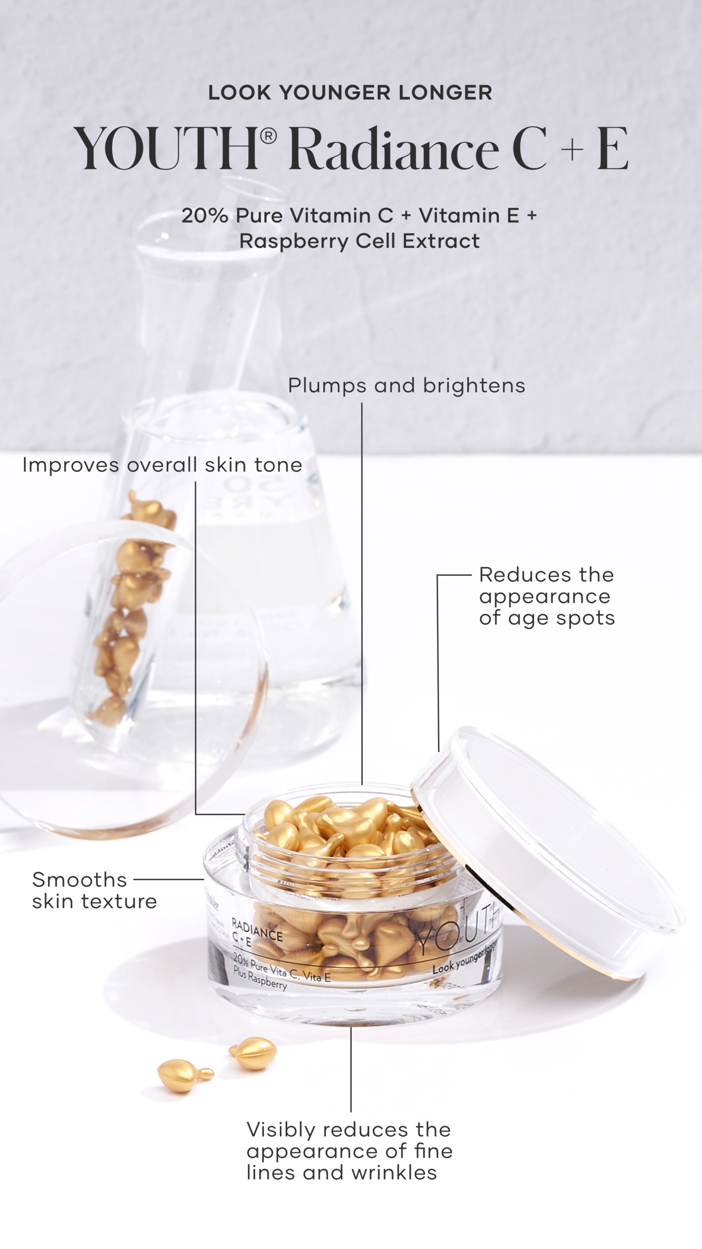 Unlock radiant, revitalized skin with YOUTH® Radiance C+E Vitamin Facial Capsules – Shaklee’s innovative, single-dose treatment that delivers a potent burst of 20% pure vitamin C (ascorbic acid – the most bioavailable form), vitamin E, and raspberry leaf cell extract in every plant-based capsule. This patented formula plumps, brightens, and visibly reduces fine lines, wrinkles, age spots, and uneven tone while smoothing texture for a more even, luminous complexion.
