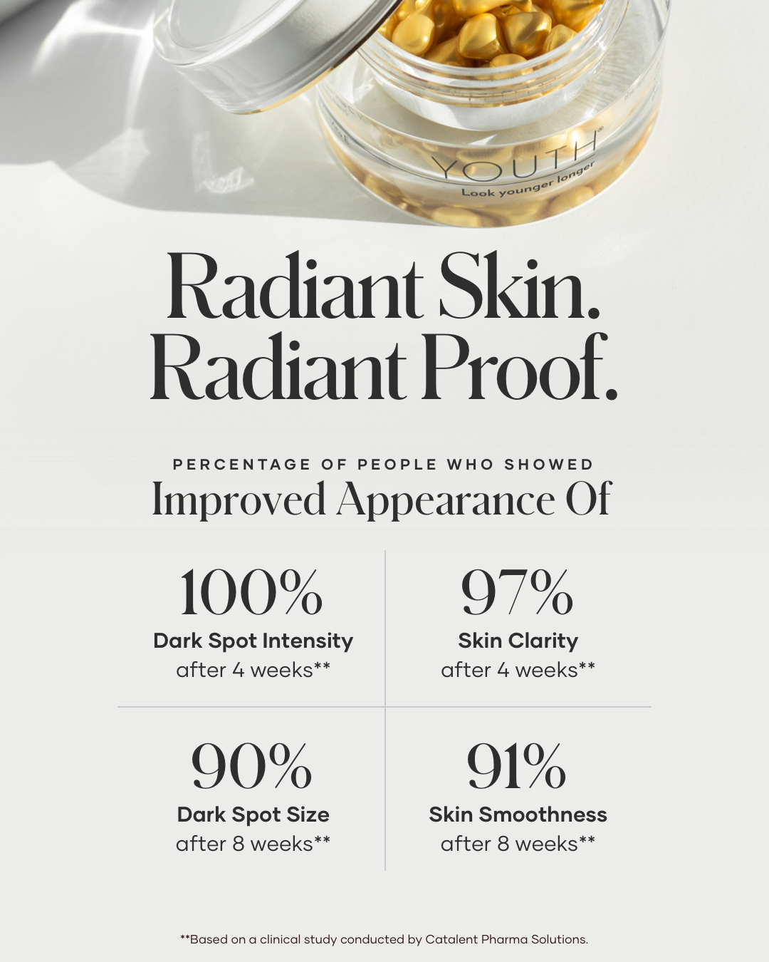 Convenient, preservative-free capsules ensure maximum potency and freshness—no oxidation worries. 100% biodegradable and plant-based, they’re perfect for eco-conscious beauty lovers. As part of the YOUTH® anti-aging collection, it accelerates cell renewal to a youthful rate, supports collagen production, and enhances the Advanced Anti-Aging Regimen’s results (clinically shown to shift skin to a younger decade via the Skin Age Index).