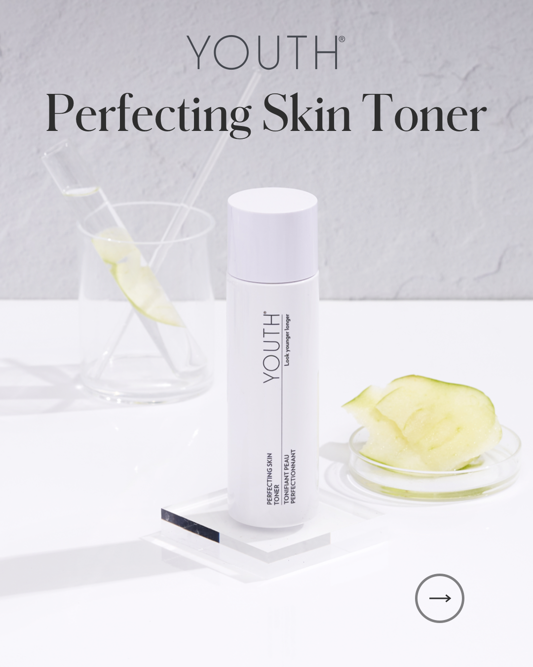 The Perfecting Skin Toner works best as part of the YOUTH® daily skincare system, designed to visibly transform your skin’s age and vitality.